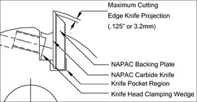 - Be sure the cutter head is completely clean and free from all foreign material in the knife pocket regions prior to installing NAPAC System. Check all corrugations in the knife head and on the NAPAC steel backing plates for nicks and burrs. Do not use a knife head or a NAPAC steel backing plate that has any nicks or burrs.
